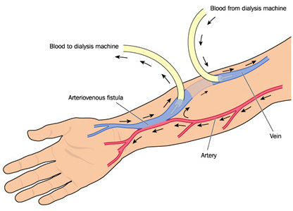Dialysis is a process used to treat patients whose kidneys are not working properly. It involves a special machine and tubing that removes blood from the body, cleanses it of waste and extra fluid and then returns it back to the body. Dialysis access is usually done by creating a radio cephalic fistula (above the wrist) or a brachiocephalic fistula (at the level of elbow).