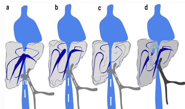 The Direct intrahepatic portosystemic shunt (DIPS) is a radiologic procedure in which a stent (a tubular device) is placed in the middle of the liver to reroute the blood flow. During the procedure, a radiologist makes a tunnel through the liver with a needle, connecting the portal vein (the vein that carries blood from the digestive organs to the liver) to one of the hepatic veins (the three veins that carry blood from the liver). A metal stent (a small, hollow tube) is placed in this tunnel to keep the track open. The TIPS procedure reroutes blood flow in the liver and reduces pressure in all abnormal veins, including the bowel and the liver.