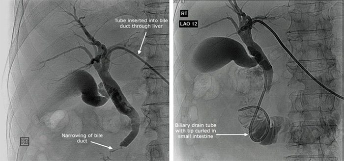 The Percutaneous Transhepatic Biliary Drainage (PTBD) Treatment Procedure is performed by an Interventional Radiologist under sterile conditions. A local anesthetic is injected into the skin of the upper abdomen where the catheter will be inserted. A fine needle is then inserted under ultrasound and fluoroscopic direction into the bile ducts in the liver. X-ray dye (contrast agent) will be injected to confirm successful entry into the duct system. A fine guide wire and catheter are then controlled under fluoroscopic guidance, past the obstruction to entering the duodenum. A biliary drainage catheter is then passed over this wire, to stretch out from the duodenum, up through the bile ducts, liver, and onto the skin. This will then be secured to the skin at the puncture site and connected to a drainage bag to collect the bile which drains out of the liver through this catheter. Sometimes if no further plan of surgery is there, a self-expanding metal stent is placed across the block with no or minimally need for an external catheter. After the procedure, the patient is kept under observation for some time. Once stable, the patient can be discharged with appropriate instructions and follow-up.